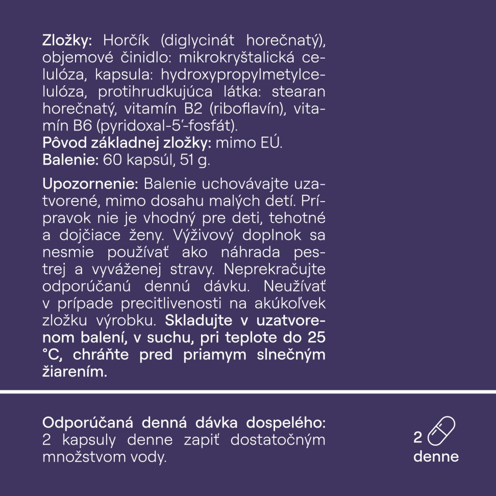 Dobrý deň, horčík je vo forme diglycinátu horečnatého. Kompletné zloženie: horčík - diglycinát horečnatý (200 mg), vitamín B2 (2 mg), vitamín B6 (2mg).
